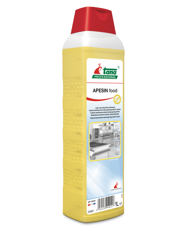 APESIN food je idealno rješenje za čišćenje i dezinfekciju u jednom koraku, omogućujući brzo i sigurno ponovno korištenje prostora za preradu hrane i institucionalnih područja. Temelji se na posebnoj kiseloj formuli koja omogućuje učinkovito uklanjanje tvrdokornih masnih, proteinskih i prljavih naslaga, kao i mikrobioloških onečišćenja. Jednostavno i bez napora uklanja kamenac, naslage vapna, sapunaste naslage te ostatke u mljekarama, pekarama, pivovarama, vinarijama i svim drugim područjima prerade hrane. Spektar djelovanja proizvoda APESIN food testiran je i potvrđen prema europskim EN standardima. Omogućuje brze i sigurne rezultate uz maksimalnu diskreciju – bez ostataka nakon primjene.